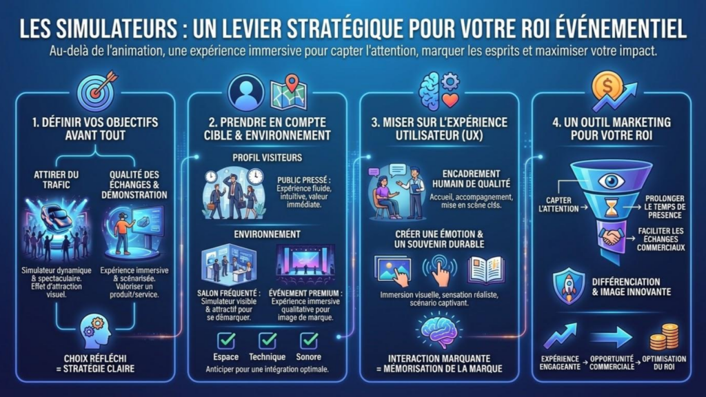 Le simulateur ne doit pas être perçu uniquement comme une animation ludique, mais comme un véritable outil marketing. Bien utilisé, il permet de capter l’attention, de prolonger le temps de présence sur le stand et de faciliter les échanges commerciaux.